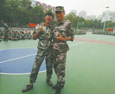 学校军训时当教官的威色火且(右)。记者 邓丹 摄