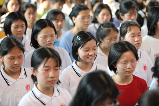 6月28日,湖南永州道县第一中学学生在紧张准备高考的同时,参加心理讲座,开展快乐减压活动。视觉中国供图