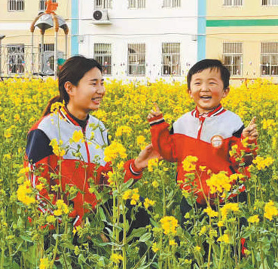 河北省大名县黄金堤乡金乡水岸幼儿园老师给孩子讲解油菜花。人民日报记者 张腾扬摄