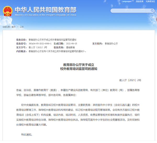 人民网北京6月15日电 (记者孙竞)今天,教育部宣布成立校外教育培训监管司。