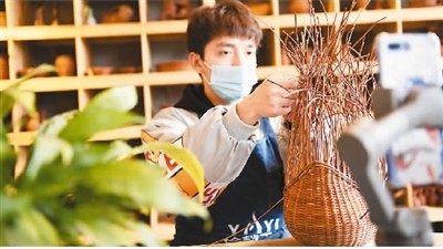 贵州省榕江县大十字社区某科技公司工坊内,一名员工正在进行网上蕨编技能培训。王炳真摄(人民图片)