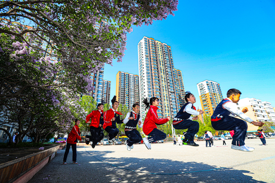 4月25日,沈阳市和睦路小学的孩子们在进行快乐大课间活动。该校保证学生每天有不少于1小时的体育锻炼时间。视觉中国供图