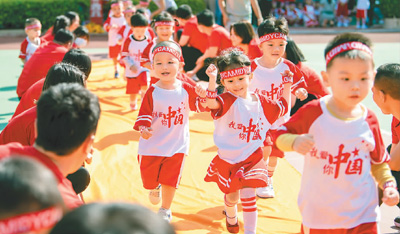11月13日,在海南省海口市跨世纪成龙幼儿园秋季亲子运动会上,家长和孩子们一起体验运动带来的快乐,加深了彼此间的情感交流。袁 琛摄(人民视觉)