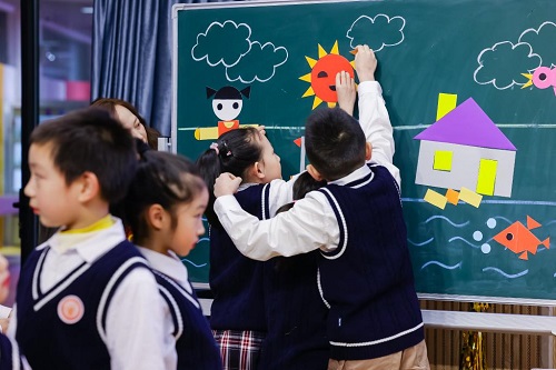 舞台上,孩子们进行着奇妙的“图形之旅”——“分一分”,分出立体与平面图形;“拼一拼”,拼出想象中的乐园;“说一说”,说出自己的创意设想……这是上海市黄浦区北京东路小学近日举行的一年级“期末考试”。