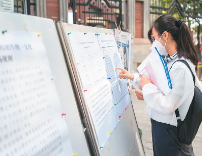 二○二二年七月七日,二○二二年上海市普通高等学校招生统一文化考试开考,五万多名考生奔赴考场。图为上海格致中学考点,考生查看考场信息。 王 初摄(人民视觉)