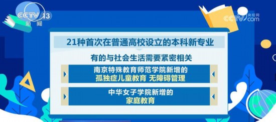 21种首次在普通高校设立的本科新专业,有的与社会生活需要紧密相关,比如南京特殊教育师范学院新增的孤独症儿童教育、无障碍管理,中华女子学院新增的家庭教育;有的与城乡建设紧密相关,比如海南大学新增的乡村治理,北京林业大学新增的国家公园建设与管理;还有的与前沿技术发展紧密相关,比如,清华大学新增的地球系统科学,华南理工大学新增的生物材料,东南大学新增的未来机器人、电动载运工程。