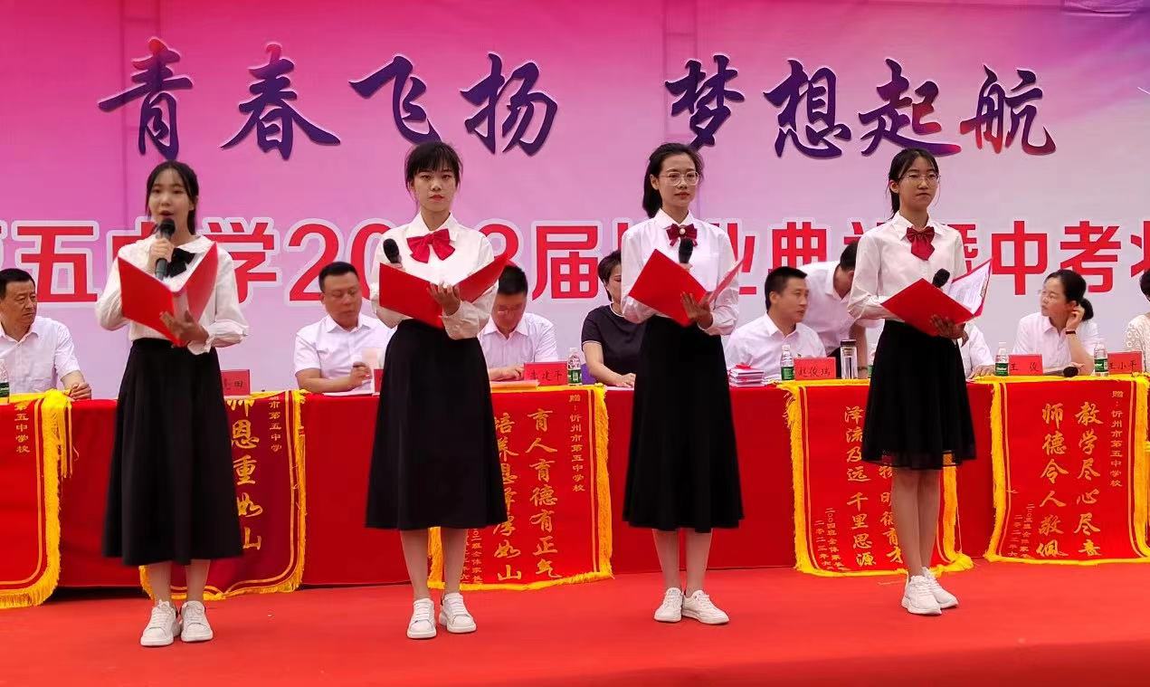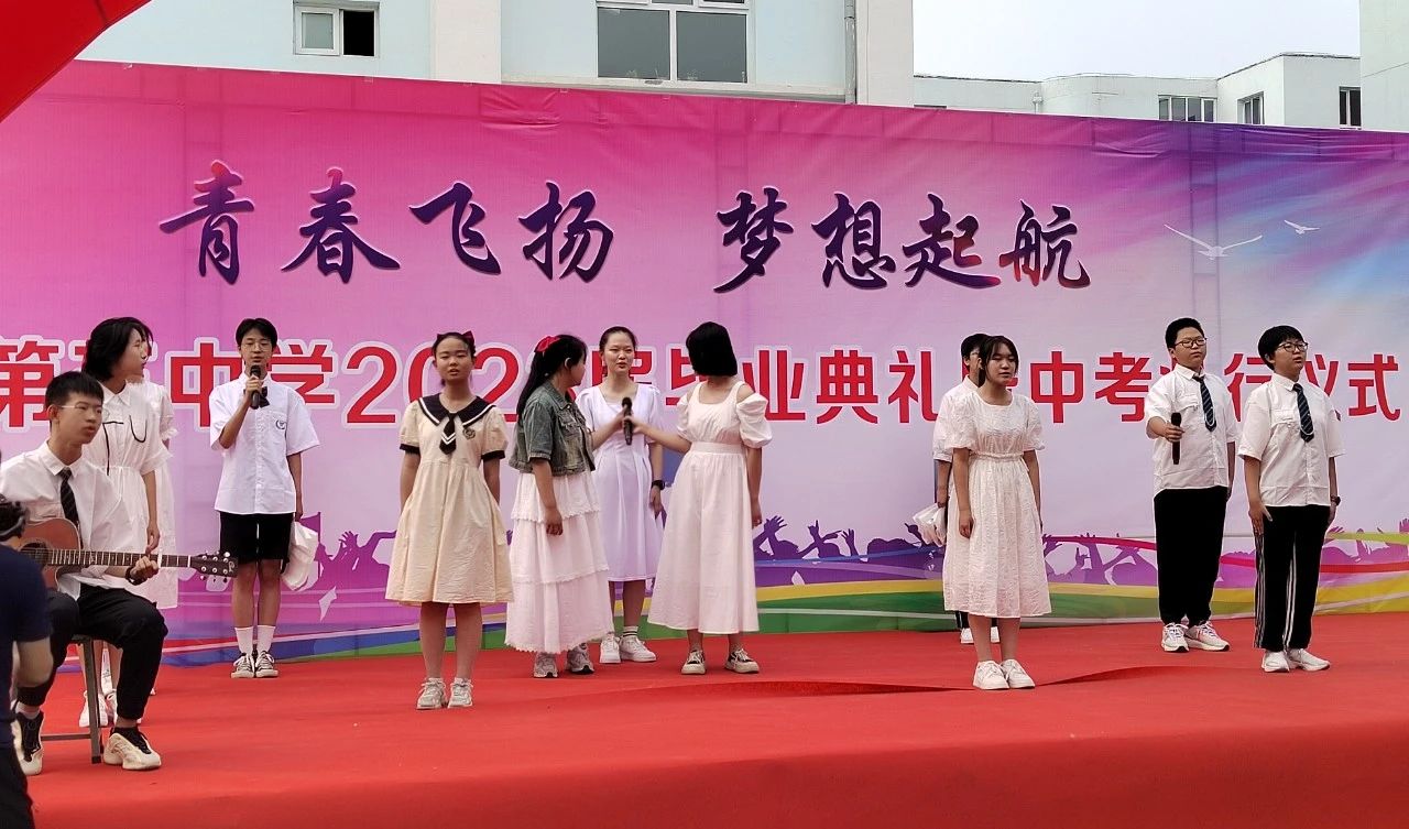 在这分别之际,张倩睿同学宣读《致母校的一封信》,代表全体初三学子以铿锵誓言报答母校的培育之恩:亲爱的五中,我的母校,您的关怀和栽培我没齿难忘,明日我们在阳光下重逢,您会发展的越来越好,而我也将成为您的骄傲!