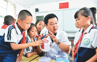 近日,在贵州省黔东南苗族侗族自治州从江县城关第三小学,眼科医生给学生讲解健康用眼知识。(石宏辉 摄 人民视觉)
