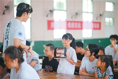 湖南省怀化市通道侗族自治县万佛山镇木脚村,大学生在给孩子们上趣味AI实验课。李尚引摄(人民视觉)