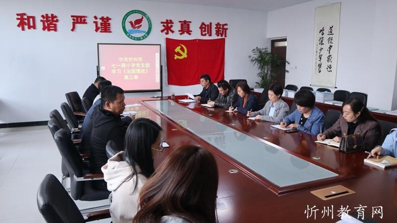 忻州市七一路小学网讯:10月19日,中共忻州市七一路小学党支部专题学习《习近平谈治国理政》第三卷。党支部书记靳茂文作专题报告,全体党员参加了会议,会议由党办主任史小荣主持。