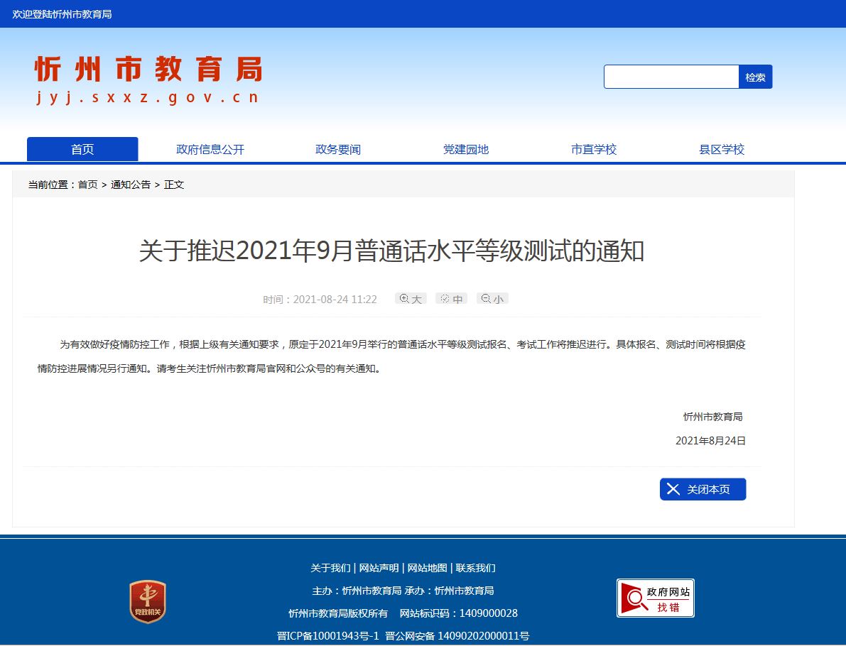 为有效做好疫情防控工作,根据上级有关通知要求,原定于2021年9月举行的普通话水平等级测试报名、考试工作将推迟进行。具体报名、测试时间将根据疫情防控进展情况另行通知。请考生关注忻州市教育局官网和公众号的有关通知。