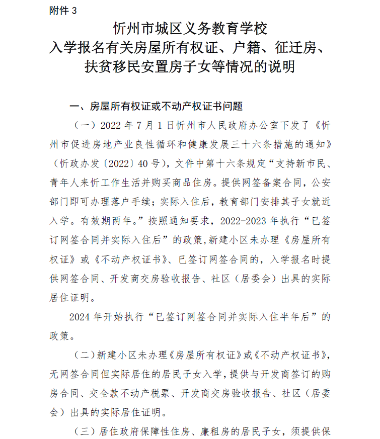 附:忻州市城区义务教育学校入学报名有关房屋所有权证、户籍、征迁房、扶贫移民安置房子女等情况的说明