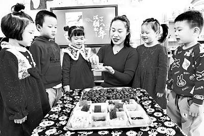山东省滨州市滨城区清怡幼教集团彭李街道中心幼儿园,孩子们在老师指导下辨识制作腊八粥的食材。 初宝瑞摄/光明图片
