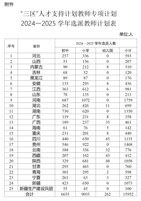 根据《通知》,2024—2025学年全国计划选派15952名教师,其中初中计划选派6655名,小学计划选派9035名,幼儿园计划选派262名。选派教师主要由各省(区、市)和新疆生产建设兵团在本行政区域范围内调配,调动省会城市、中心城市、非受援县的优质教师资源支持省内受援县。