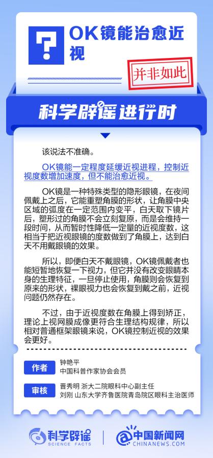 OK镜能一定程度延缓近视进程,控制近视度数增加速度,但不能治愈近视。OK镜是一种特殊类型的隐形眼镜,在夜间佩戴上之后,它能重塑角膜的形状,让角膜中央区域的弧度在一定范围内变平,白天取下镜片后,塑形过的角膜不会立刻复原,而是会维持一段时间,从而暂时性降低一定量的近视度数。但它并没有改变眼睛本身的生理特征,一旦停止使用,角膜则会恢复到原来的形状,裸眼视力也会恢复到戴之前。(来源:@科学辟谣中国新闻网微博 )
