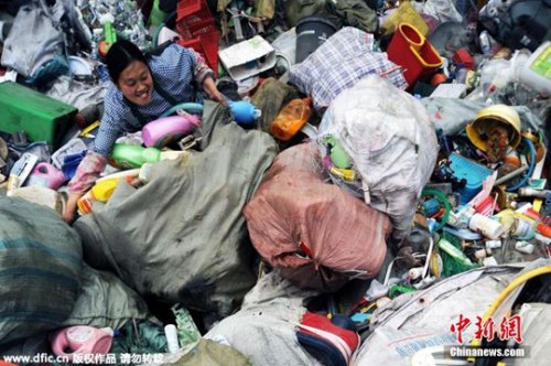 资料图。2015年4月6日,重庆,这是清理工在堆码场将大包的垃圾转运至分拣点,以方便开包处理。 江上鸥 摄 图片来源:东方IC