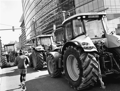 欧盟与俄罗斯之间的相互制裁导致欧盟成员国农产品价格下跌,引发农民不满。图为今年3月,比利时农民将拖拉机开上布鲁塞尔的街道,进行抗议示威。人民视觉