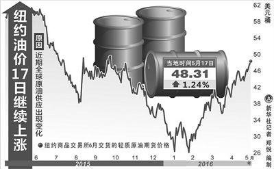 近期,国际原油价格屡现攀升,逼近每桶50美元。5月17日,截至当日收盘,纽约商品交易所6月交货的轻质原油期货价格上涨0.59美元,收于每桶48.31美元,涨幅为1.24%。7月交货的伦敦布伦特原油期货价格上涨0.31美元,收于每桶49.28美元,涨幅为0.63%。分析认为,一些突发因素导致了近期油价攀升,国际油市实现供需平衡仍需时日。