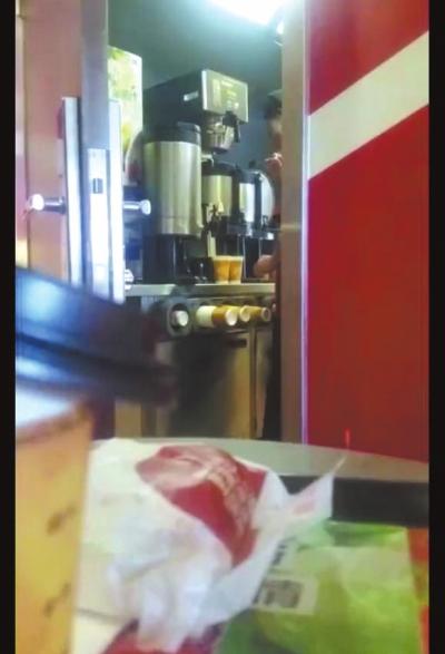 前天上午,网友“心里小兔跳跳de”发布微博称,“今天在北京站的麦当劳拍下后厨服务员用一杯豆浆兑水兑出了两杯,用勺子尝了口,之后把用过的勺子又放进杯里继续搅。”