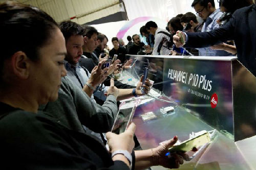 2月26日,在西班牙巴塞罗那举行的世界移动通信大会开幕前,人们试用中国品牌华为新发布的P10和P10 Plus手机。(新华社)