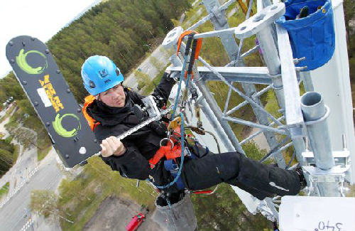 2016年5月12日,在芬兰中部城市卡亚尼,工程师卡莱纽斯在一处基站塔顶调试华为公司生产的天线。(新华社)