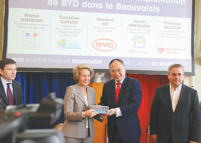 本报法国博韦3月23日电 (记者曹鹏程、殷新宇、李鹤)中国企业比亚迪23日在此间宣布,向法国上法兰西大区投资1000万欧元,成立电动汽车组装厂。比亚迪欧洲区总经理何一鹏、上法兰西大区议会主席格扎维埃·贝特朗、博韦市市长卡洛琳娜·卡耶出席了新闻发布会。