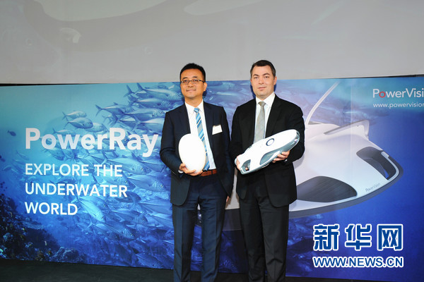 北京臻迪机器人有限公司创始人兼CEO郑卫锋及公司销售负责人SAGE RATERMAN展示PowerRay和无人机PowerEgg。新华网记者 华义 摄