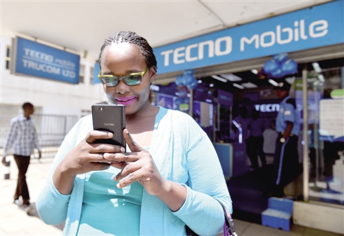 在肯尼亚首都内罗毕市中心,一名女子在一家传音手机专卖店前使用自己的传音手机。10年间,来自中国深圳的传音手机在非洲年销售量从不到100万台增至近8000万台,荣登国产手机海外销量榜首,旗下社交聊天软件注册用户过亿。 (新华社发)