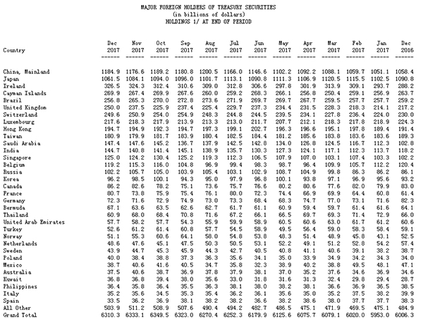 据2月15日美国财政部公布的数据,截至2017年12月,中国持有美国国债1.18万亿美元,较上个月增持83亿美元,为美国最大的海外债券持有国,其次为日本。2017年全年来看,中国共增持美国国债1265亿美元,增持力度创下2010年以来最大。