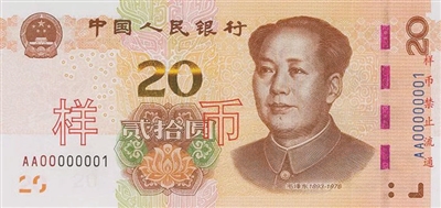 20元、10元纸币,正面中部面额数字分别调整为光彩光变面额数字“20”、“10”,取消全息磁性开窗安全线,调整左侧胶印对印图案,右侧增加光变镂空开窗安全线和竖号码。