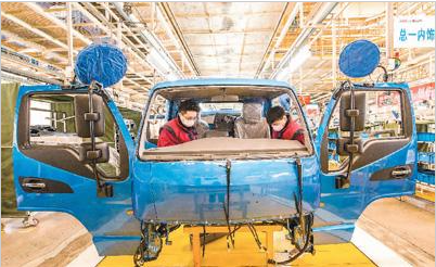 2月11日,在山东省青州市一家汽车制造企业生产车间内,工人正在组装生产轻型卡车。 王继林摄(人民视觉)