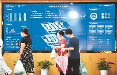 浙江省杭州市的5G农贸市场——骆家庄农贸市场的大屏幕上实时显示交易、客流等相关情况。新华社记者 韩传号摄