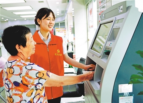 湖南邵阳农商银行党员志愿者向客户介绍银行查询机使用方法。滕治中摄(中经视觉)