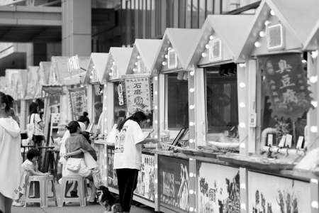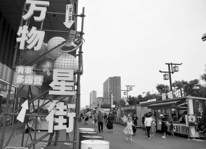 傍晚时分,狭长的夕阳阴影下,太原解放路上白天的闷热慢慢散去,有了些许清凉。万达广场上人声喧闹,又是一番火热景象。以万达广场为中心的商圈,是太原城北最繁华的地段。进入6月,万达广场前空地上的万物星街开启,沿路一字排开的摊位上,商品琳琅满目,人流如织,热闹非凡。