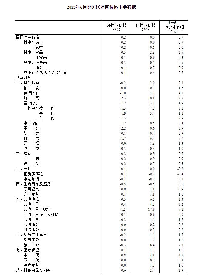2023年6月份,全国居民消费价格同比持平。其中,城市持平,农村下降0.1%;食品价格上涨2.3%,非食品价格下降0.6%;消费品价格下降0.5%,服务价格上涨0.7%。1—6月平均,全国居民消费价格比上年同期上涨0.7%。