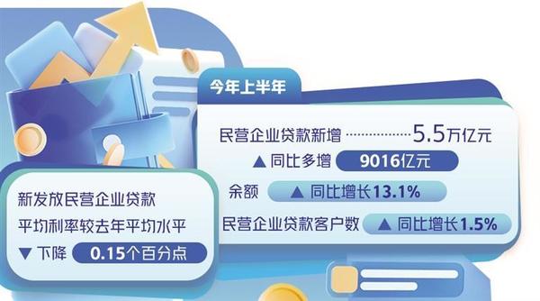近年来,信贷支持民营企业的力度不断加大,融资成本稳中有降。数据显示,今年上半年,民营企业贷款新增5.5万亿元,同比多增9016亿元,余额同比增长13.1%;民营企业贷款客户数同比增长1.5%;新发放民营企业贷款平均利率较去年平均水平下降0.15个百分点。