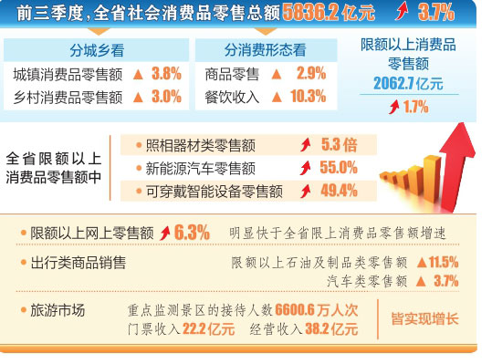 前三季度,全省消费呈现哪些特点。据省统计局相关负责人介绍,新型消费快速增长,全省限额以上消费品零售额中,照相器材类零售额增长5.3倍,新能源汽车零售额增长55.0%,可穿戴智能设备零售额增长49.4%。限额以上网上零售额增长6.3%,明显快于全省限上消费品零售额增速;出行类商品销售带动明显,全省限额以上石油及制品类零售额增长11.5%,汽车类零售额增长3.7%;旅游市场持续回暖,全省重点监测景区接待人数6600.6万人次,门票收入22.2亿元,经营收入38.2亿元,皆实现增长。