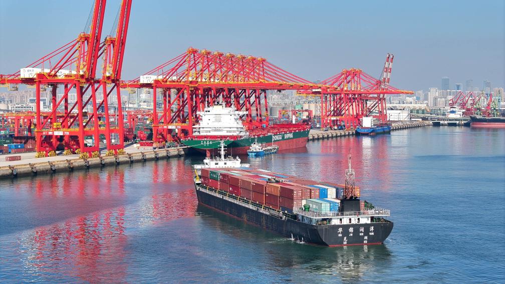 在山东港口日照港,货轮停泊集装箱码头装卸作业(1月10日摄,无人机照片)。新华社记者 郭绪雷 摄