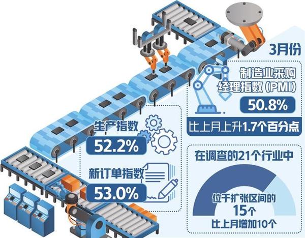 国家统计局服务业调查中心高级统计师赵庆河表示,3月份,随着企业加快复工复产,市场活跃度提升,制造业PMI升至50.8%,重返扩张区间。在调查的21个行业中有15个位于扩张区间,比上月增加10个,制造业景气面明显扩大。