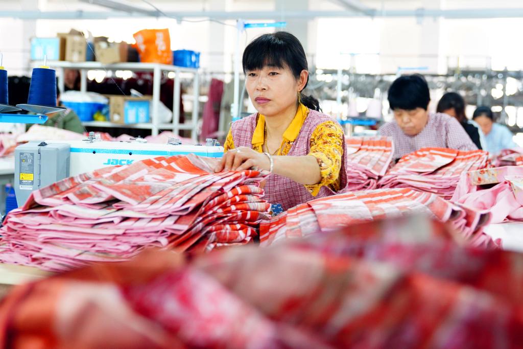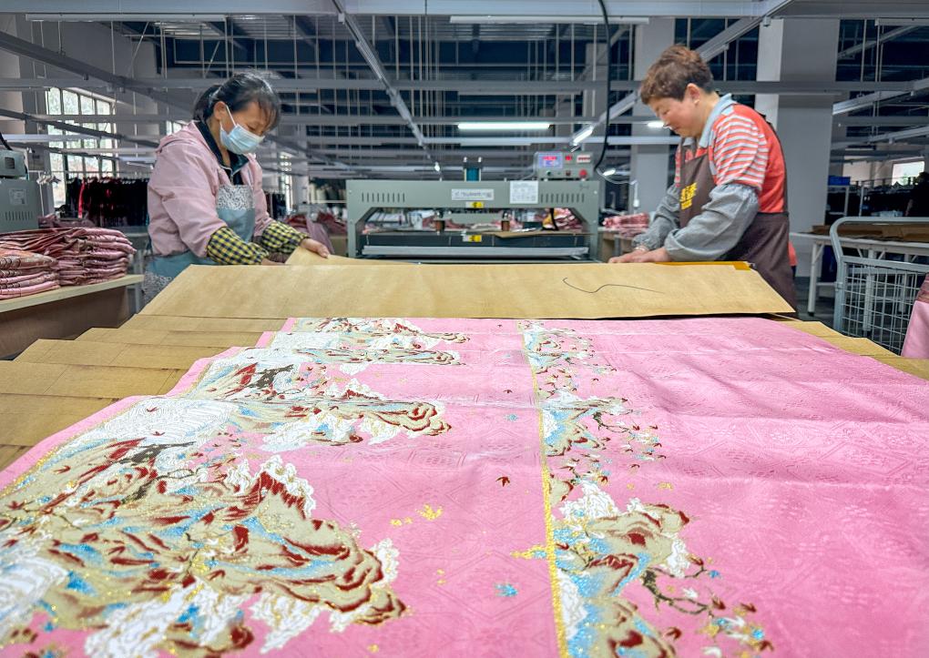 4月13日,在曹县有爱云仓汉服基地,工作人员在加工马面裙。新华社记者 郭绪雷 摄