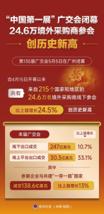 第135届广交会5日在广州闭幕。自4月15日开幕以来,共有来自215个国家和地区的24.6万名境外采购商线下参会,比上届增长24.5%,创历史新高。本届广交会线下出口成交247亿美元,线上平台出口成交30.3亿美元,分别比上届增长10.7%和33.1%。
