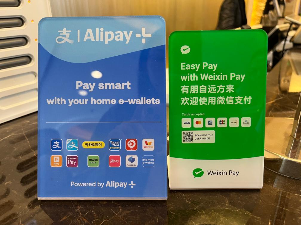 北京香格里拉饭店内摆放的支付宝、微信支持使用境外电子钱包和境外银行卡标识。新华社记者张千千 摄