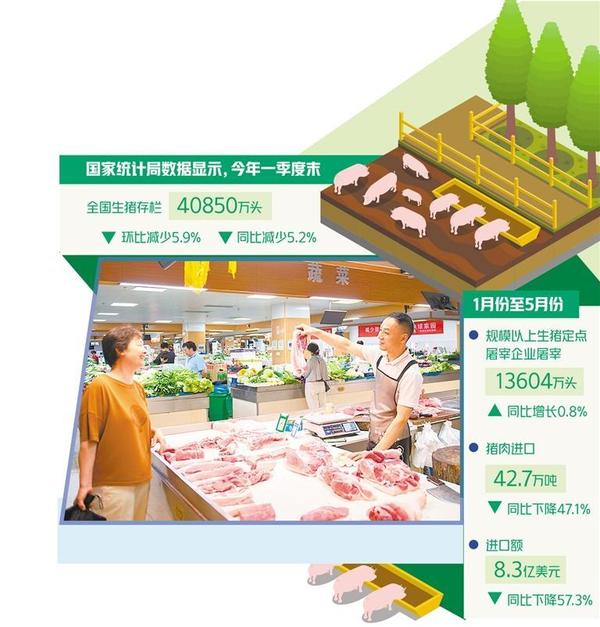 国家统计局数据显示,今年一季度末,全国生猪存栏40850万头,环比减少5.9%,同比减少5.2%。一季度,全国生猪出栏19455万头,同比下降2.2%;猪肉产量1583万吨,同比下降0.4%。5月末能繁母猪存栏3996万头,环比增长0.2%,同比下降6.2%。1月份至5月份规模以上生猪定点屠宰企业屠宰13604万头,同比增长0.8%。2月份开始屠宰量低于上年同期,5月份规模以上生猪定点屠宰企业屠宰2666万头,同比下降5.0%。
