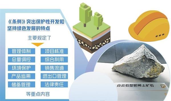 《稀土管理条例》(以下简称《条例》)日前公布,自2024年10月1日起施行。《条例》明确,稀土资源属于国家所有,国家依法加强对稀土资源的保护,对稀土资源实行保护性开采。同时,鼓励和支持稀土产业新技术、新工艺、新产品、新材料、新装备的研发和应用,持续提升稀土资源开发利用水平,推动稀土产业高端化、智能化、绿色化发展。专家认为,《条例》首次以行政立法形式规范稀土资源的开发利用,主要规定了管理体制、项目核准、总量调控、综合利用、环境保护、销售流通、产品追溯、进出口管理、储备管理、法律责任等重点内容,突出了保护性开发和坚持绿色发展的特点,对推动稀土产业高质量发展具有重大意义。规范稀土资源开发利用稀土是现代工业中不可或缺的重要元素和关键战略资源。中国有色金属工业协会党委书记、会长葛红林表示,稀土被誉为“工业维生素”,是高新技术产业和国防科技工业的关键原料,是关系国家安全和国民经济命脉的战略资源,对推动新型工业化发展具有不可替代性。中国稀土集团党委书记、董事长敖宏介绍,稀土是改造提升传统产业、发展战略性新兴产业和国防科技工业不可或缺的关键材料。随着新能源汽车、风力发电、智能制造等战略性新兴产业和节能电机等传统产业改造升级,全球稀土需求快速增加。近年来,我国围绕稀土行业准入标准、行业整合、环境保护等方面出台了多项政策措施,产业发展良好,带动建立起相对完整的产业体系,资源储量、产量、消费量、贸易量均居世界第一位,并持续加强稀土资源保护开发和合理利用,为科技进步和经济社会发展作出了突出贡献。瞄准新一轮科技革命和产业变革方向,我国加快稀土供给侧结构性改革,不断开辟发展新领域新赛道、塑造发展新动能新优势,产业链不断完善,产业规模不断扩大,产品品种不断丰富,产品质量不断提高,市场规模不断扩大,国际影响力持续提升。但稀土管理仍存在一些突出问题,包括覆盖全产业链的管理职责、监管措施有待完善,产业创新能力和绿色化智能化水平亟需提高,行业秩序需要进一步规范,整治非法开采或非法冶炼分离、无指标或超指标生产、买卖非法稀土产品等违法行为的手段不足、处罚力度不够。随着行业的不断发展,产业链条的持续延伸,稀土产业缺少综合性法律法规的问题日益凸显,难以满足行业高质量发展需求。稀土行业涵盖开采、冶炼分离、产品流通、二次利用、进出口以及储备等诸多环节,涉及中央政府多个管理部门,亟需依法建立分工明确、密切配合的管理体制。葛红林认为,稀土产业大而不强、全而不精的问题依然存在,在制度保障衔接、资源保护性开发、原始基础创新、行业秩序规范等方面仍面临一些困难和挑战。“特别是在工艺绿色化、产品高端化、制造智能化方面有待提升,产业结构要持续优化,产业秩序需要进一步规范。”敖宏说。推进产业转型升级包钢(集团)公司党委常委、副总经理兼北方稀土党委书记、董事长刘培勋认为,《条例》为解决制约产业高质量发展的堵点、难点开出了法治良方。完善了生态环境保护、资源储备的有关规定,形成了更加科学有效的管理方式,更有利于稀土资源的保护性开发;明确提出国家鼓励科技创新和人才培养,支持稀土新产品、新材料、新工艺的研发和产业化,更有利于稀土资源的高质化利用;建立起从国家到地方再到企业分层管理、各司其职、各负其责的治理体系,并首次对违法违规行为设定处罚标准,进一步加压引导行业秩序整顿,更有利于行业规范化管理。《条例》致力于促进稀土产业高质量发展。工业和信息化部原材料工业司相关负责人解读,国家对稀土产业发展实行统一规划,并突出科技创新。鼓励和支持稀土产业新技术、新工艺、新产品、新材料、新装备的研发和应用。鼓励和支持企业利用先进适用技术、工艺对稀土二次资源进行综合利用。同时,实现绿色发展、安全生产。从事稀土开采、冶炼分离、金属冶炼、综合利用的企业应当遵守有关矿产资源、节能环保、清洁生产、安全生产和消防的法律法规。葛红林分析,《条例》鼓励行业技术创新和人才培养,支持稀土新产品、新材料、新工艺的研发与产业化,有利于推进稀土产业传统领域强基转型与优化升级,加快形成战略性新兴产业发展的新方向和新路径,在生产力水平上实现更大突破、更大发展。我国是稀土资源大国和生产大国,多年来以不到全球40%的稀土资源供应了70%以上的稀土原料,为保障国内外需求作出重要贡献,但在稀土资源和生态环境保护方面也面临较大压力。葛红林表示,《条例》将稀土开采、稀土冶炼分离实行总量调控管理以法律法规的形式进一步明确,并要求加强环境保护,不但有利于从源头强化资源开发管理,而且充分表明了我国走生态优先、绿色低碳发展之路的坚强决心。此外,《条例》鼓励支持稀土综合利用产业合规有序发展,将有效缩减行业对不可再生矿产资源的需求,延长矿产资源开采使用年限,降低废弃物排放对自然生态的危害,有力推动稀土产业安全绿色可持续发展。敖宏介绍,中国稀土集团将坚持保护资源与开发利用并重。在大型资源利用基地建设和产业优化布局中,聚焦高端化、智能化、绿色化发展。供给端坚持稳中求进、加快构建现代化产业体系,需求端