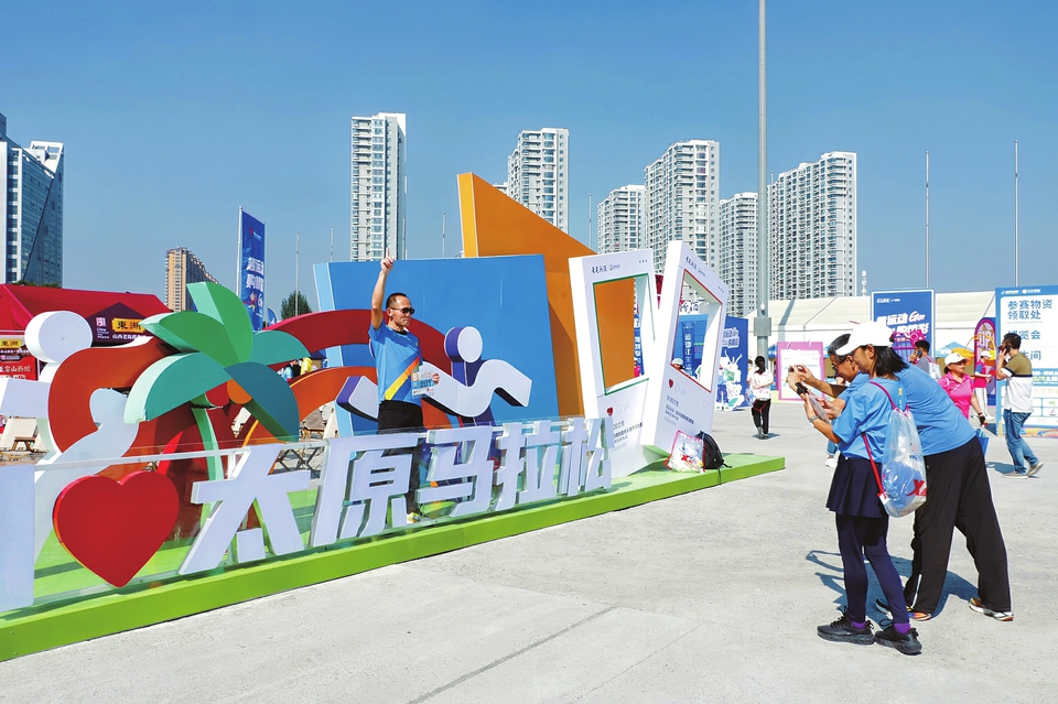 9月19日,2024太原体育消费周启动仪式在省城晋阳湖国际会展中心举行。围绕开赛在即的太原马拉松赛,体育消费周在该中心推出互动娱乐游戏、文体产品展示销售、特色美食市场等十余项特色活动。图为参赛选手在展板前拍照留念。