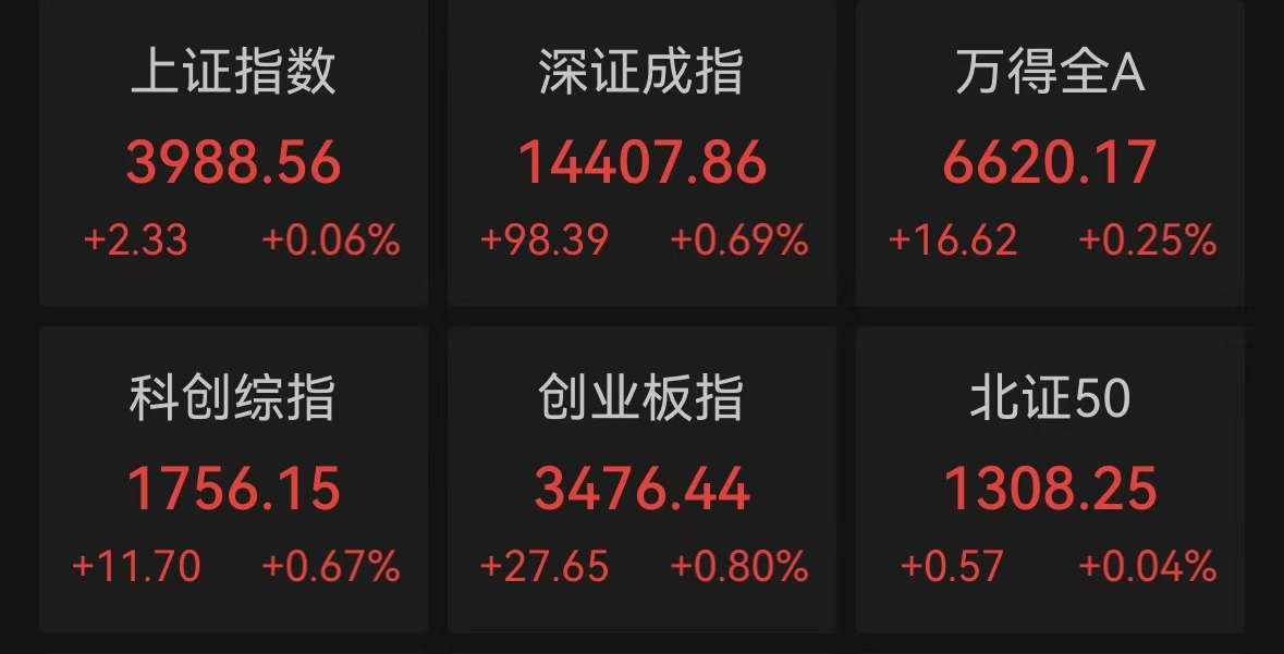 中新网4月13日电(记者 谢艺观)13日,A股三大股指集体收红。截至收盘,上证指数涨0.06%,深证成指涨0.69%,创业板指涨0.8%。盘面上,建材、电脑硬件、基本金属等行业板块涨幅居前。