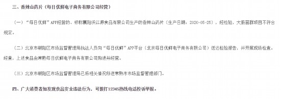 《通告》指出,北京市朝阳区市场监督管理局执法人员向“每日优鲜”APP平台(北京每日优鲜电子商务有限公司)送达检验报告,并开展现场检查。经查,上述食品由常熟每日优鲜电子商务有限公司购进并经营。北京市朝阳区市场监督管理局已将相关情况移送常熟市市场监督管理部门。