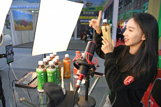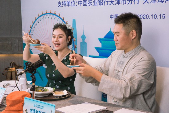 10月16日,在2020中国旅游产业博览会上,主播通过直播推介美食。新华社发