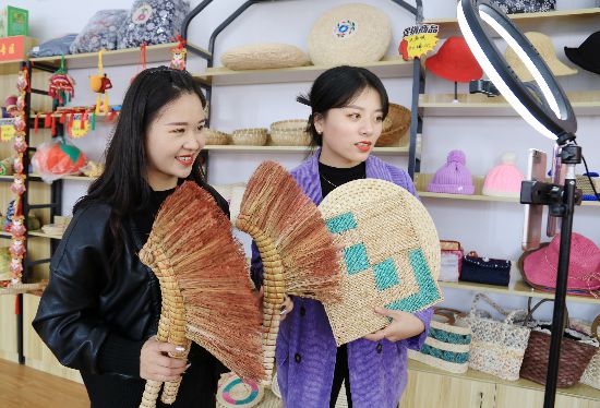 10月16日,安徽淮南市一家参展企业通过直播平台,进行线上寿州香草香包展示。陈彬摄(人民视觉)