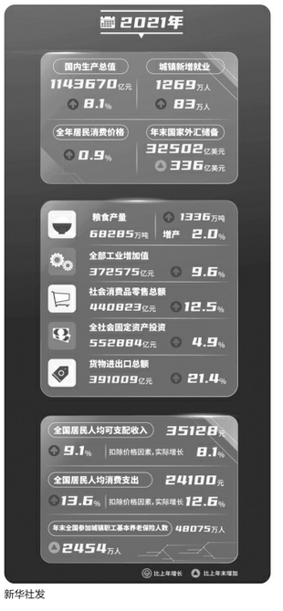 国家统计局2月28日发布的2021年国民经济和社会发展统计公报显示,2021年,面对百年变局和世纪疫情,全国上下共同努力,我国经济发展和疫情防控保持全球领先地位,构建新发展格局迈出新步伐,高质量发展取得新成效,实现了“十四五”良好开局。